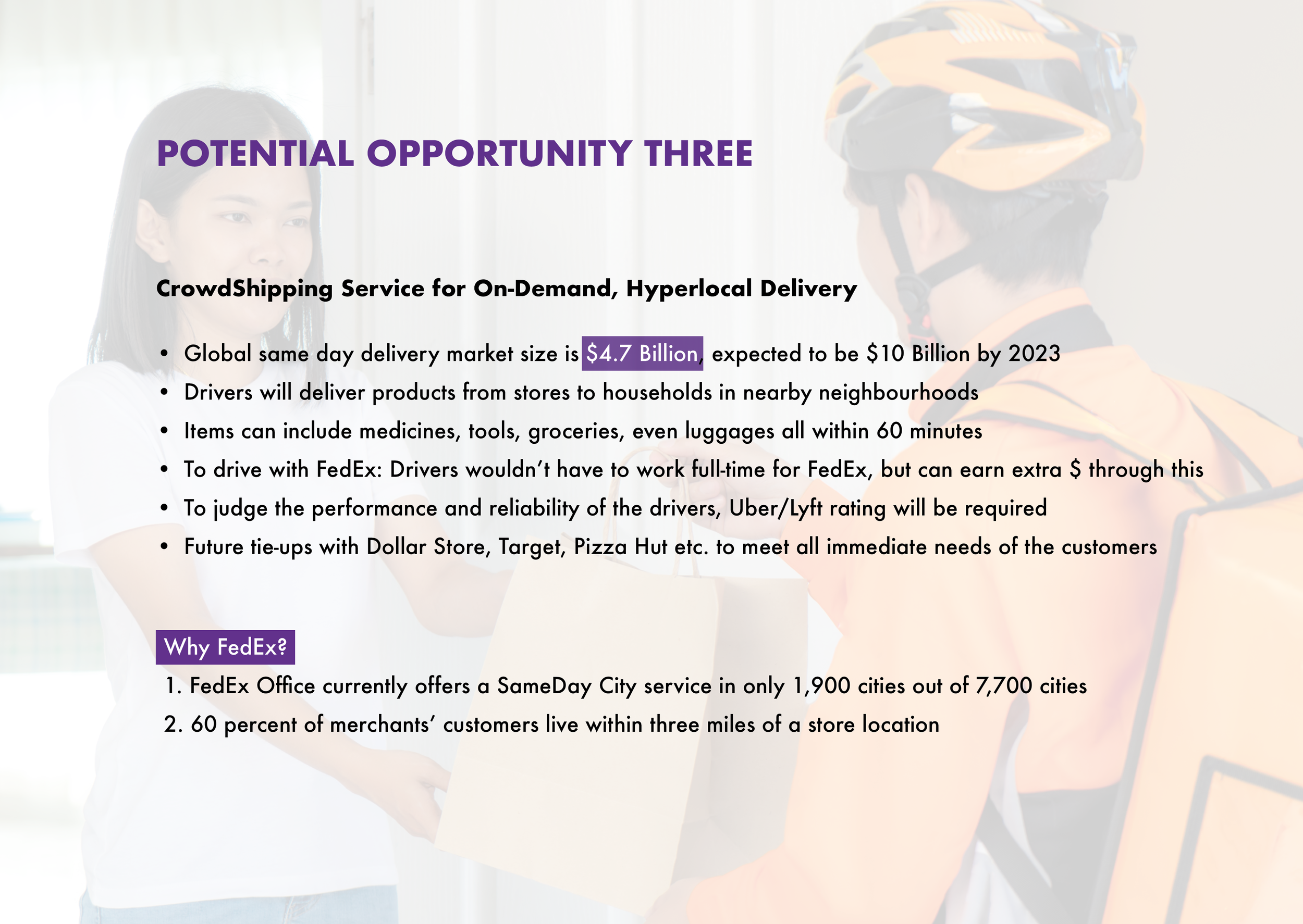 As designers, we were tasked with partnering with a company and raising their revenue by 20% through design-led innovation. We chose to work with the FedEx Corporation. How might we design a product/service that results in 20% growth for FedEx?