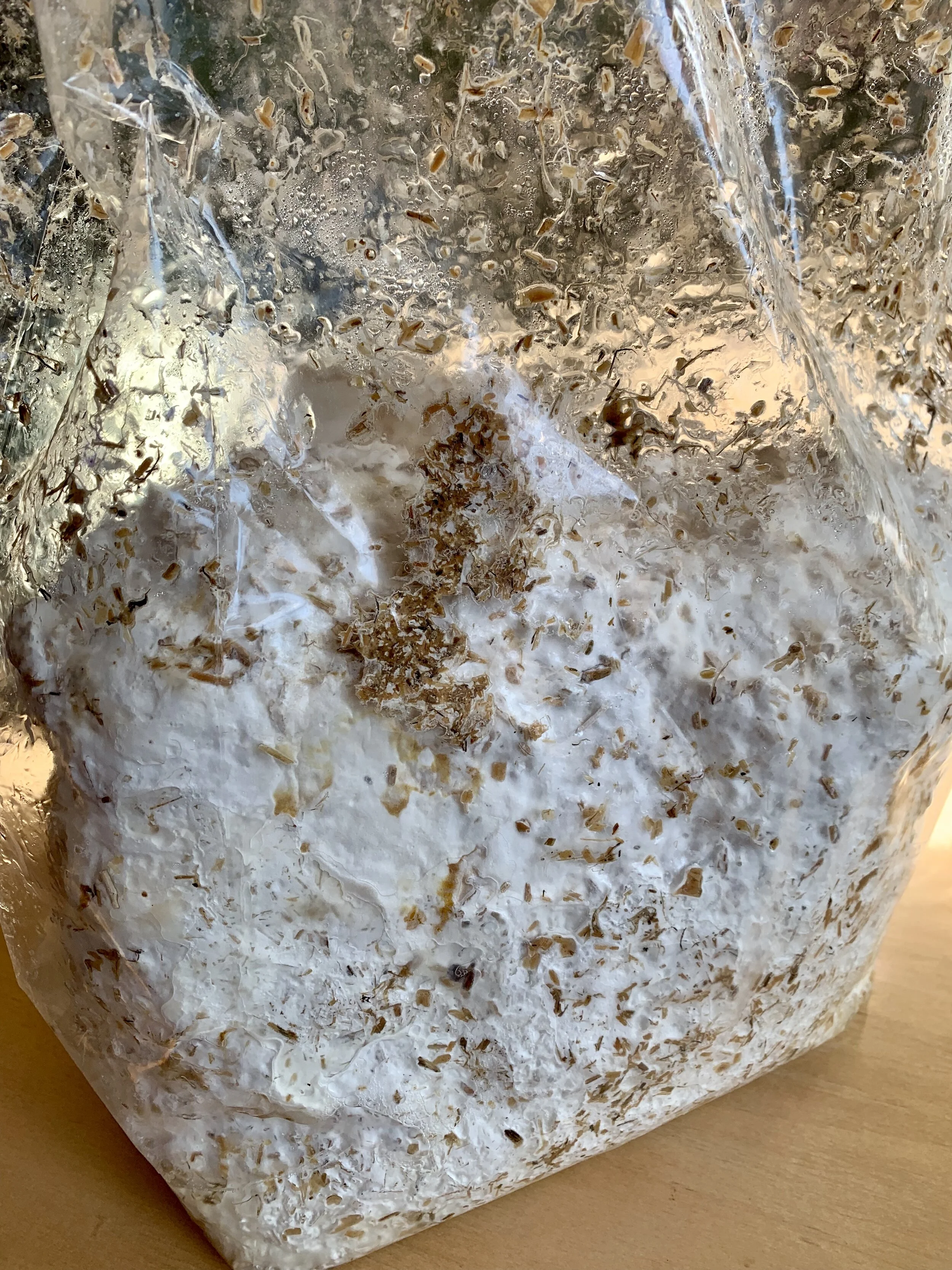 Ecovative’s premade wood substrate inoculated with mushroom mycelium, is mixed with wheat flour and water to give the mushroom an initial growth time for approx. 5 days. After which the particles in the bag are broken apart and put into a mold so the mycelium grows in that enclosed shape. It takes 5 more days for mycelium to regain the shape of the mold, after which it should be left to dry and can be baked to quicken the process.
