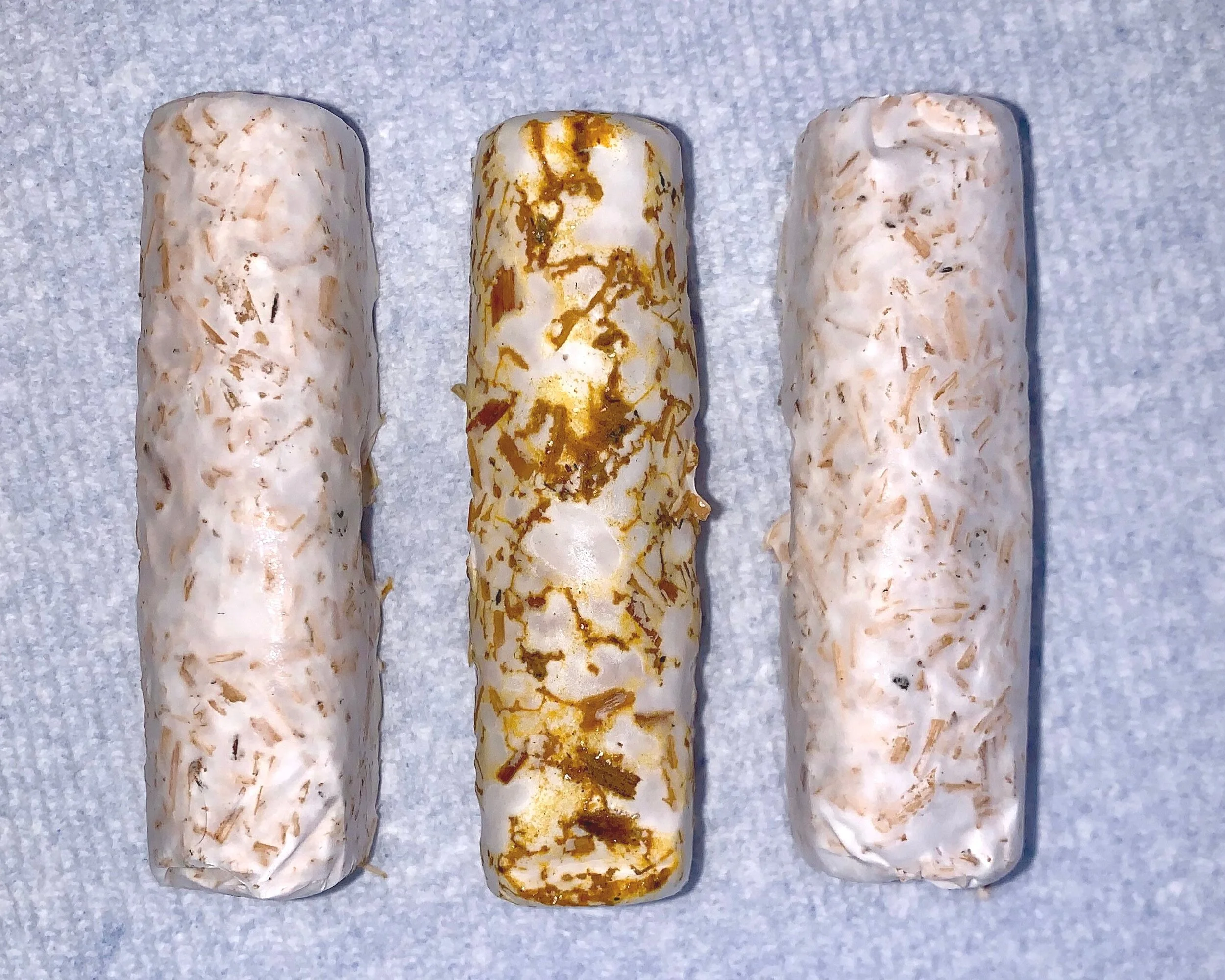 Added turmeric dye in the middle piece to see the effect, only the wood substrate absorbed the dye and reflected yellow colour, while the mycelium’s colour did not change.